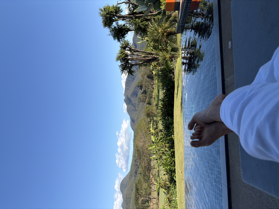 The scene depicts an outdoor setting in Pai, Thailand, viewed from a reclining position. In the immediate foreground, the bare feet and lower legs of an individual, clad in a white robe or towel, are visible, crossed at the ankles while resting on a dark grey lounge chair. Directly ahead is an infinity-edge swimming pool featuring blue square tiles, reflecting the clear blue sky and adjacent trees. Beyond the pool, a strip of manicured green grass leads to a dense expanse of tropical vegetation, including banana trees and various leafy plants, transitioning into what appears to be cultivated farmland. The background is dominated by a range of forested mountains under a clear blue sky with scattered white clouds. To the right of the pool, several tall, slender trees with foliage at their crowns, along with broad-leaved plants and a large succulent in an orange planter, are visible.