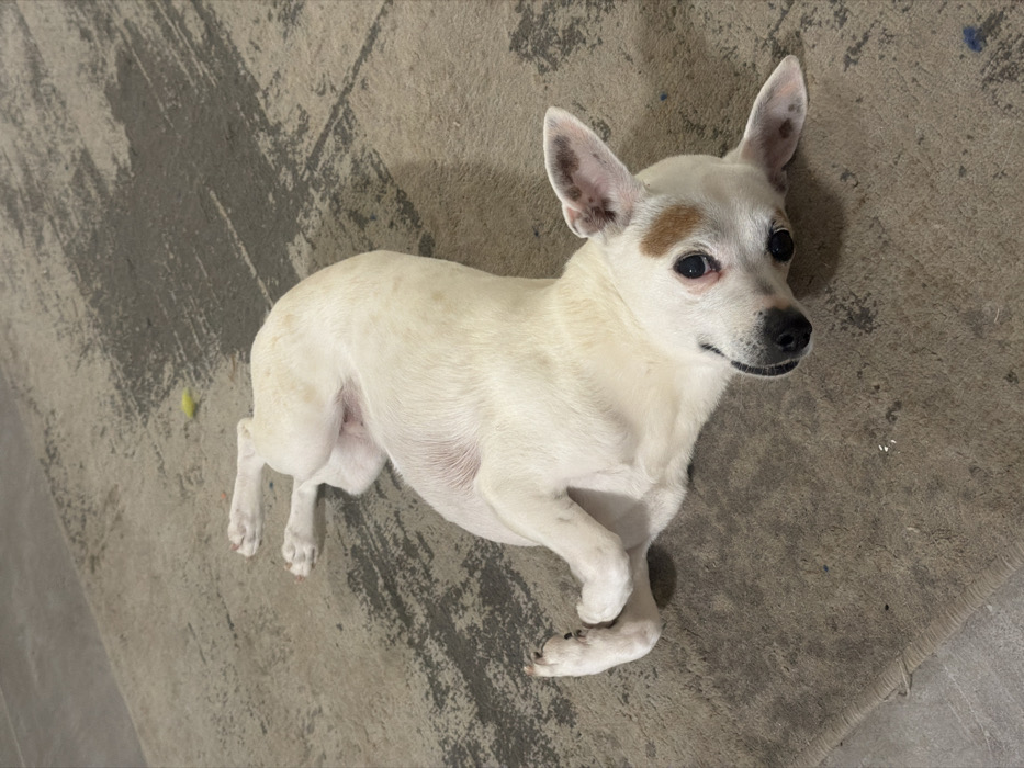 An indoor scene in Nahariyya, Israel, depicts a small, short-haired dog lying on its back on a light brown area rug with a distressed grey pattern. The dog is primarily white with light brown patches, notably one above its right eye and scattered on its body. Its head is turned towards the camera, with dark eyes and nose. Its front paws are curled near its chest, and its rear legs are bent. A small, pale yellow object is visible on the rug in the upper portion of the frame. A darker floor surface is partially visible along the left edge of the image.