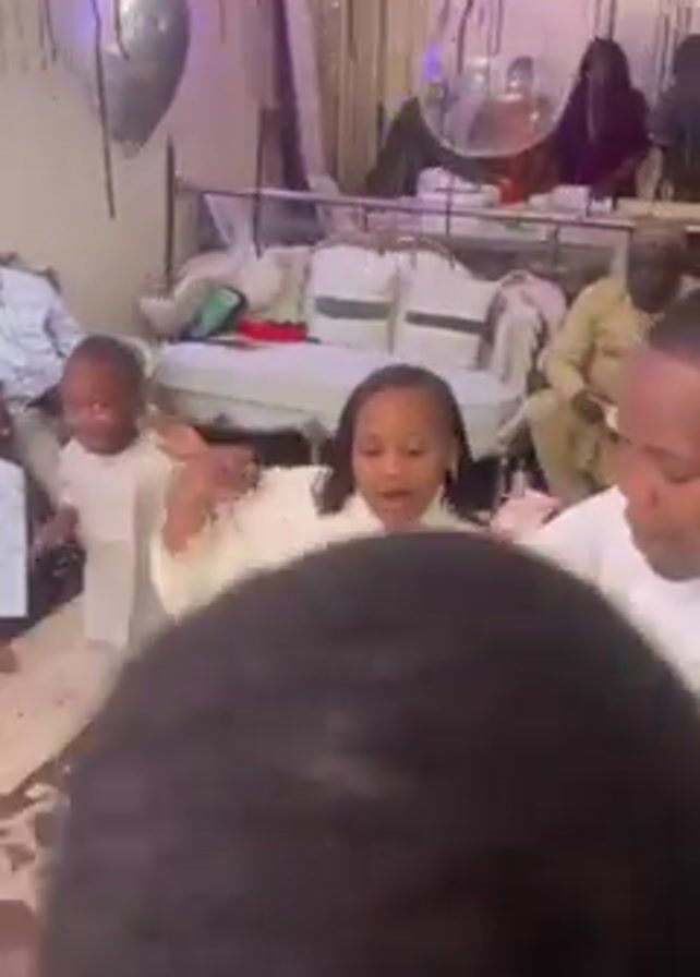 Inside a room decorated with balloons and tinsel, two children wearing white outfits are dancing. The younger child, a girl, is throwing what appears to be money into the air while they dance. Several adults are seated in the background, some watching the children. A couch with decorative pillows is visible behind the dancing children. The room is lit by soft, artificial light.