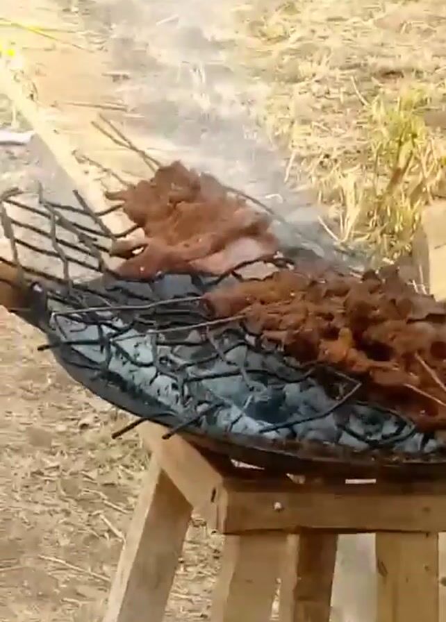 meat being cooked on a makeshift grill. The grill, made of metal bars, sits atop a simple wooden structure made of rough-cut lumber. Underneath the grill, embers and charcoal are visible, providing the heat source. The meat, in varying shades of brown, covers most of the grill. Some smoke is rising from the cooking meat. The setting appears to be outdoors, with dry grass and other vegetation visible in the background.
