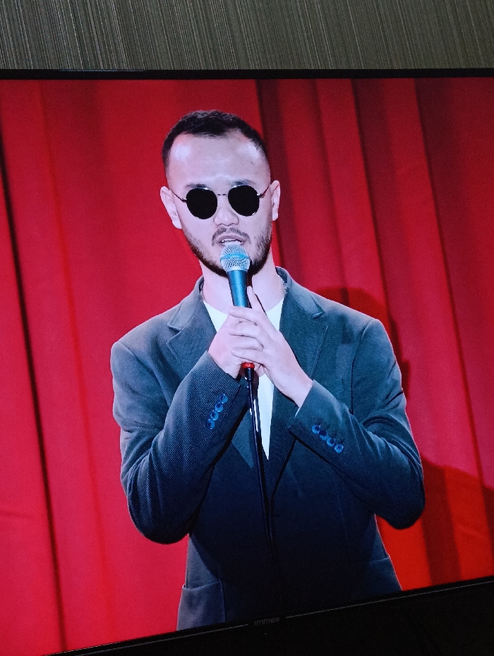 - "The scene depicts a male individual on a stage in Urtaaul, Uzbekistan, against a backdrop of draped red curtains" by FM-XmAi43, licensed under CC BY 4.0
