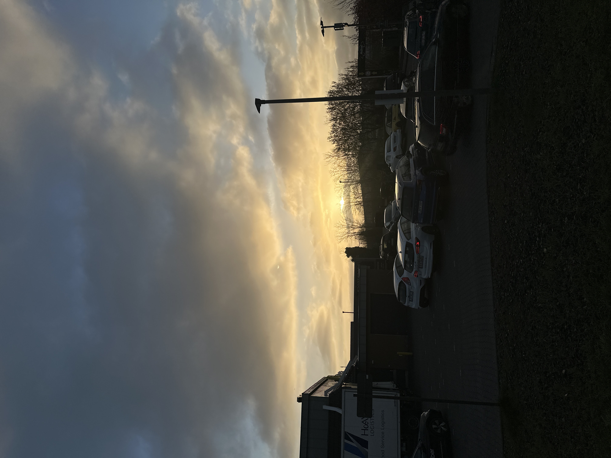 street scene in Holzwickede, Germany at sunset. The sky is predominantly cloudy, with dark clouds on the left and golden sunlight filtering through the clouds towards the center and right. Several cars are parked along the side of the street. A tall light pole is visible in the middle ground. The edge of a building with a truck parked in front of it is visible at the bottom of the image, with "H&S Logistics Food Service Logistics" printed on the truck. The overall scene appears to be a quiet, industrial or commercial area during the evening.