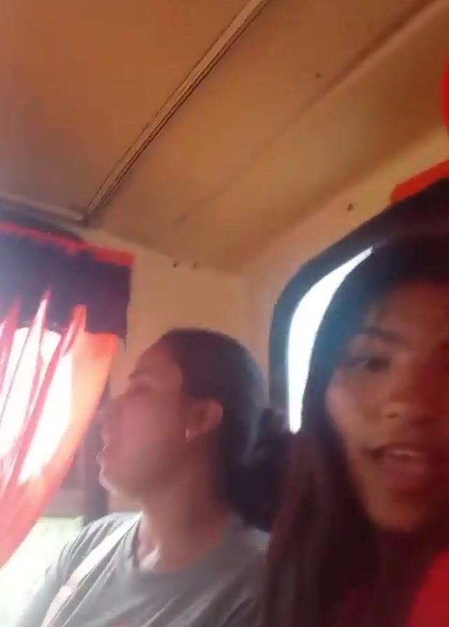 Two young women are on a boat, singing along to loud music. The woman on the left is wearing a grey t-shirt, and the one on the right is in a red shirt. They both look like they are enjoying themselves. The boat interior is visible, with a window and curtains.