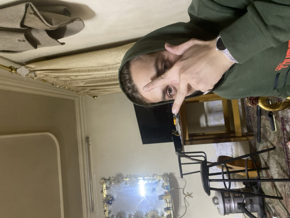 A male individual is depicted indoors in At-Tall, Syria. He is seen from the chest up, wearing a dark green hooded sweatshirt. His right hand is raised, with the index and middle fingers extended, partially obscuring his face below the eyes. He has short dark hair and a light beard. A silver-toned watch with a rectangular, stone-embellished band is worn on his left wrist. The background reveals a domestic setting with a patterned rug on the floor. To the left, a silver Hitachi 2100W vacuum cleaner, a black stool, and a brown acoustic guitar are visible. A wooden table supports a dark-screened television and a black rectangular electronic device. On the wall, a gold-framed ornate mirror with circular decorative elements reflects a bright light source, and several small objects are positioned on a shelf beneath it. The walls are light-colored and exhibit minor marks. A fluorescent light fixture is mounted on the wall. Light-colored, patterned curtains hang from a gold rod on the right, and a light brown jacket is suspended from the wall nearby. The ceiling is light-colored with decorative molding. A segment of ornate gold-colored furniture is partially visible in the bottom right foreground.