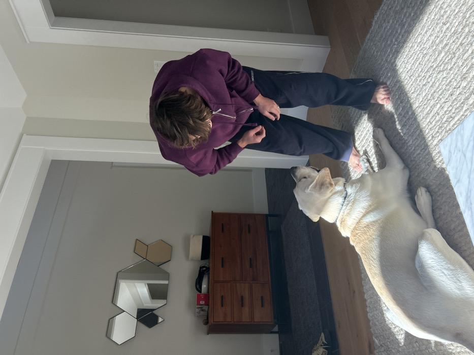 The image depicts an indoor scene in Squamish, Canada, featuring one person and one dog. A light-colored Labrador Retriever dog, wearing a dark collar, is lying on its stomach on a light beige woven rug in the foreground, looking upward. A male individual, positioned to the right of the dog, is bending forward at the waist, directing his gaze downward towards the animal. He is wearing a dark purple hooded zip-up sweatshirt and dark blue athletic pants with white stripes along the sides, and is barefoot. Strong natural light illuminates the scene from the right, creating distinct shadows on the rug. The flooring beneath the rug is light wood, transitioning to a dark tiled floor in the background entryway, where a dark gray area rug is present. In the background to the left, a wooden console table with six drawers and dark metal legs stands against a pale wall. On top of the console are a red box, a pair of black headphones, and a two-tone (white and black) woven basket. Above the console, a multi-piece wall mirror composed of six hexagonal/diamond-shaped reflective panels, some clear and some with a golden tint, is mounted. White door frames are visible on the right side of the image, outlining doorways to adjacent rooms.