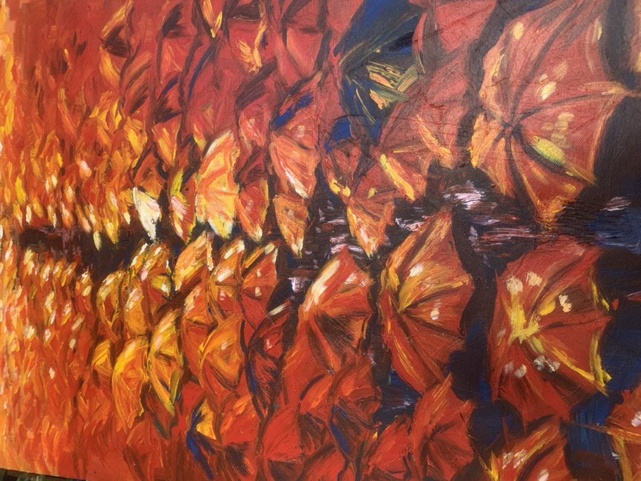 An impressionistic oil painting depicts a densely populated street scene in Kabong, Nigeria, viewed from an elevated perspective. The scene is dominated by a multitude of open umbrellas, primarily rendered in shades of red and orange, with intermittent yellow and white highlights, suggesting a warm light source. These umbrellas are closely clustered, forming a continuous, textured canopy. Dark, vertical brushstrokes beneath and between the umbrellas indicate the presence of numerous human figures. A central, darker passageway extends from the foreground towards the background, flanked on both sides by the crowd holding umbrellas. The environment is characterized by a warm, intense color palette throughout the composition.
