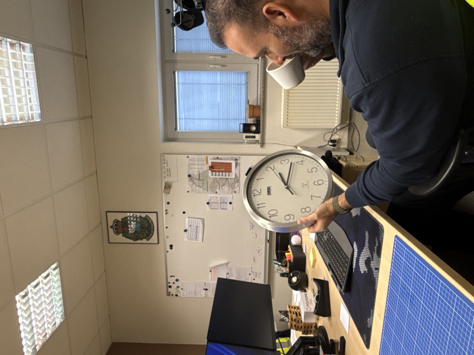 The scene depicts an adult male in an office environment, situated in Grevenmacher, Luxembourg. The man, characterized by short dark hair and a beard, is seated in a black office chair, wearing a dark blue long-sleeved garment. His left arm is extended, holding a large, round, silver-framed wall clock with a white face, displaying approximately 2:15. Simultaneously, his right hand holds a white ceramic mug to his mouth as he drinks. A dark wristband is visible on his left wrist. The office features a light-colored wooden desk on which a dual-monitor computer setup is visible, along with a black keyboard resting on a patterned mousepad, and a blue grid cutting mat. Desk items include a black Polygone-brand tape dispenser, a stack of yellow sticky notes, a pen holder, a white ball, and a small wooden structure. The wall behind the desk holds a white magnetic whiteboard covered with multiple documents secured by pushpins. Above the whiteboard, a framed crest is mounted, featuring a crown over a green shield and partially visible text, including "Luxembourg," which correlates with the specified location. To the right, a window fitted with blue horizontal blinds allows ambient light. Below the window is a white panel radiator. On the window ledge, a small black speaker, a terracotta pot, and a black camera or light stand are present. The ceiling is composed of acoustic tiles, incorporating two rectangular fluorescent light fixtures.