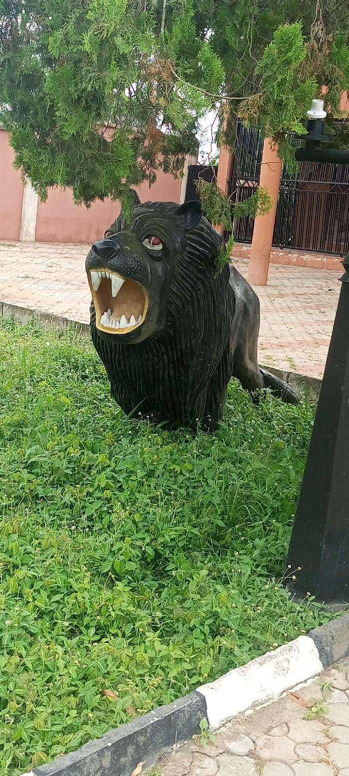 - "This image captures an outdoor scene in Ila Orangun, Nigeria, centered on a dark-colored, stylized statue of a roaring lion or beast" by FM-sBMxH3, licensed under CC BY 4.0