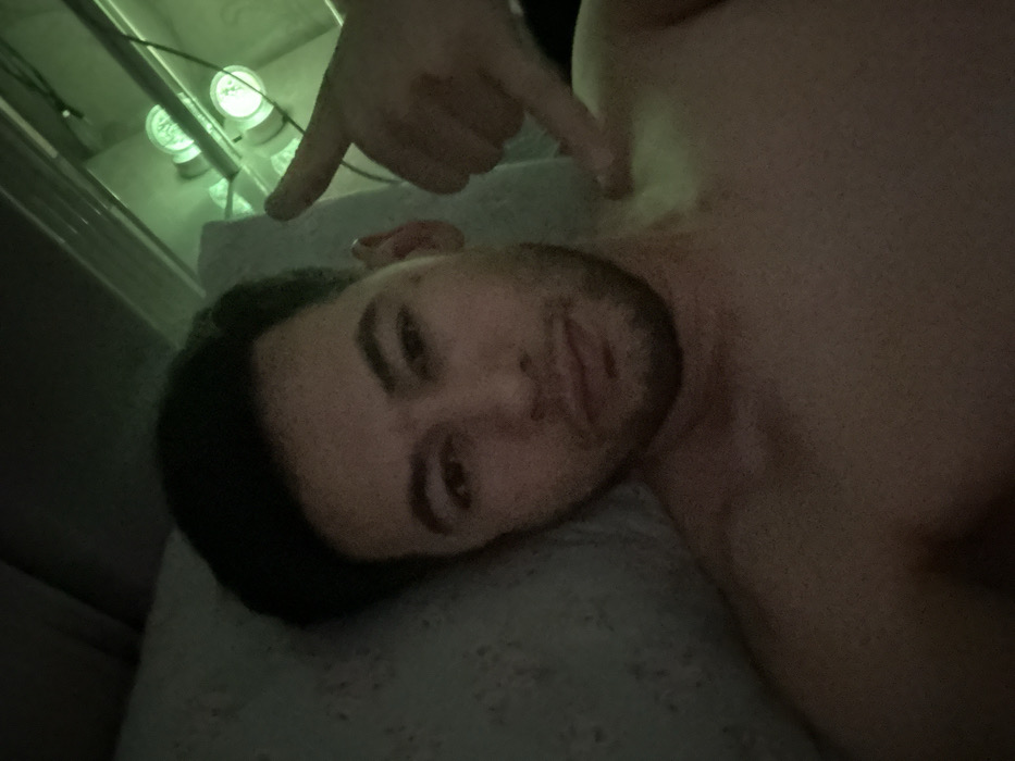 A man with dark hair and a beard is lying on a patterned surface, likely a bed or pillow. He is facing the camera with a relaxed expression. A hand, seemingly belonging to another person, is pointing with two fingers towards the man's upper chest or shoulder area. There's a faint green light source visible near the edge of the frame, possibly from some decorative lighting or a nearby device. The overall lighting is dim, and the focus appears to be on the man's face.