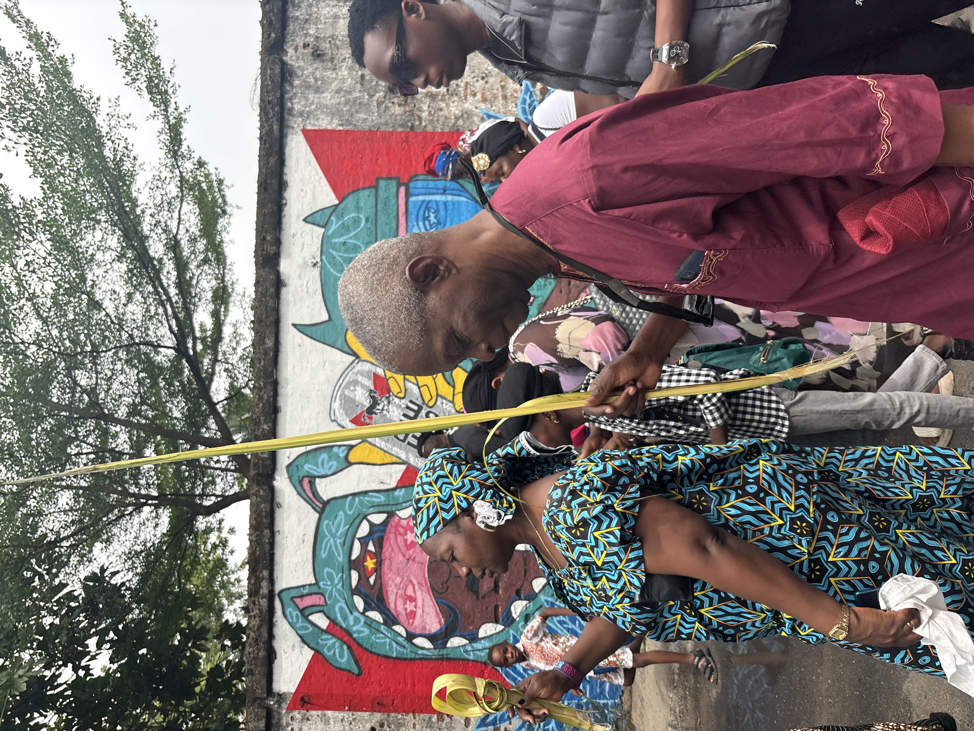 A medium, eye-level, outdoor shot captures a group of people during a Palm Sunday procession in Lagos, Nigeria. The individuals are processing along a sidewalk with a painted wall as a backdrop. In the foreground, a woman wearing a vibrant, blue and black patterned headwrap and dress is seen holding a palm frond. Behind her, an older woman with grey hair and wearing a maroon top bends forward. A younger man with sunglasses and wearing a puffy vest stands at the back. Several other individuals are partially visible in the frame. The procession appears to be taking place on a city street. The wall has a mural depicting a colorful, stylized creature. Foliage from a tree is seen on the left side of the frame. Sunlight is subdued due to overcast conditions. All of the individuals in the frame appear to be focused on the procession.