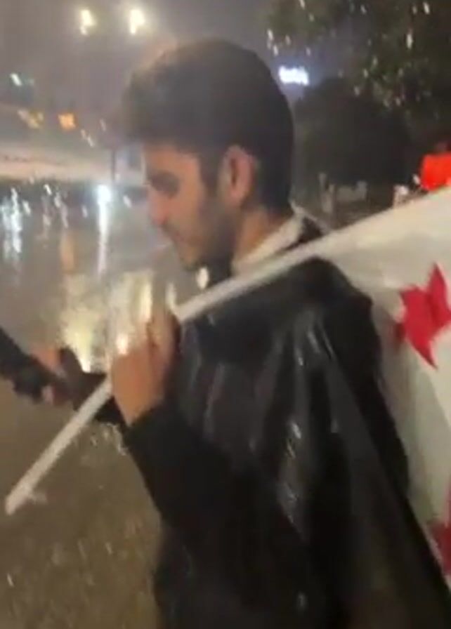 A young man stands on a wet street at night holding a Syrian flag draped over his shoulder. He is wearing a dark jacket and appears to be looking at his phone. The street is illuminated by streetlights reflecting on the wet pavement. Cars pass by in the background. The man says "Syria, Syria" and makes a sound of lightheartedness.
