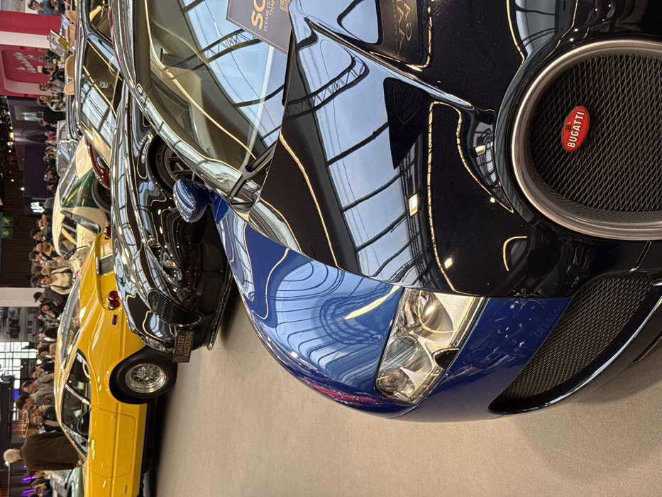 The image captures an indoor automotive exhibition or showroom located in the city of Vanves, France. In the foreground, a two-tone Bugatti hypercar is prominently displayed, showing its front-right section. The vehicle features a dark blue/black finish on its hood and the iconic horseshoe grille with a red "BUGATTI" emblem, contrasted with a lighter blue finish on its left front fender and headlight. The car's highly reflective surfaces show distinct reflections of the overhead lighting and the building's ceiling structure. In the midground, directly behind the Bugatti, a glossy black classic or custom vehicle is parked, with a ground-level sign reading "GALLERY AALDERING" positioned in front of it. To the left of this black car, a bright yellow classic sports car, identifiable by its rear-quarter profile and multi-spoke wheels, is visible. The background reveals numerous attendees, consisting of both men and women, dispersed throughout the venue, observing the vehicles. They are dressed in various casual attire. Further luxury and classic automobiles, including a light-colored car with green accents, are discernible further back. The environment consists of a spacious hall with a light-colored floor, a high ceiling featuring visible structural elements and overhead lighting, and distant exhibition banners or signage.