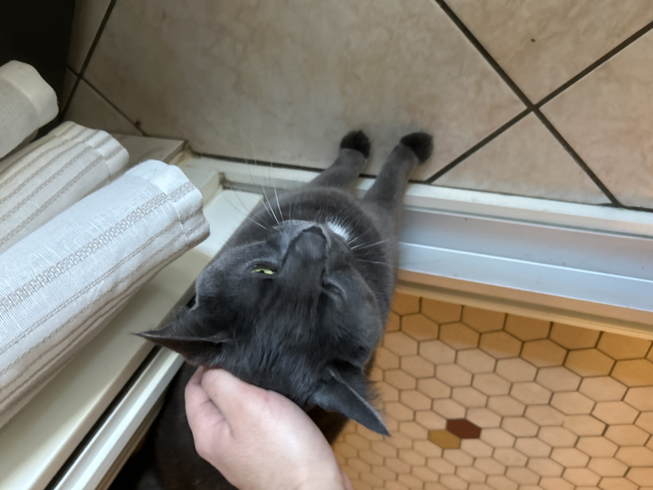 The image depicts an indoor scene within the city of Saint-Quentin, France. A gray domestic short-haired cat with prominent yellow-green eyes and a small white patch of fur on its throat is positioned near a threshold or doorframe. A human hand, with light skin tone, is shown petting the cat's head, specifically behind its left ear. The cat is looking slightly upwards and to its left. The flooring to the left of the threshold consists of light-colored hexagonal tiles with one dark brown hexagonal tile visible. To the right of the threshold, the flooring is composed of larger, light-colored square tiles with dark grout lines. Above the cat and to the right, a vertical section of light-colored fabric with faint horizontal stripe patterns, consistent with a curtain or towel, is visible. The scene is illuminated, casting no strong shadows, indicating ambient light.