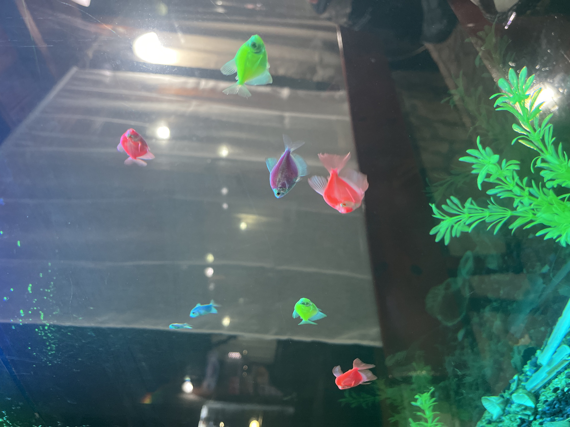 The image depicts an aquarium with several brightly colored fish swimming inside. The fish are various shades of green, pink, red, blue, and purple, appearing to be GloFish tetras. The tank contains artificial green plants. The lighting is bright, reflecting off the water surface. The background is dark and blurry. There is no indication of the location or any connection to Marino pole, Bulgaria.