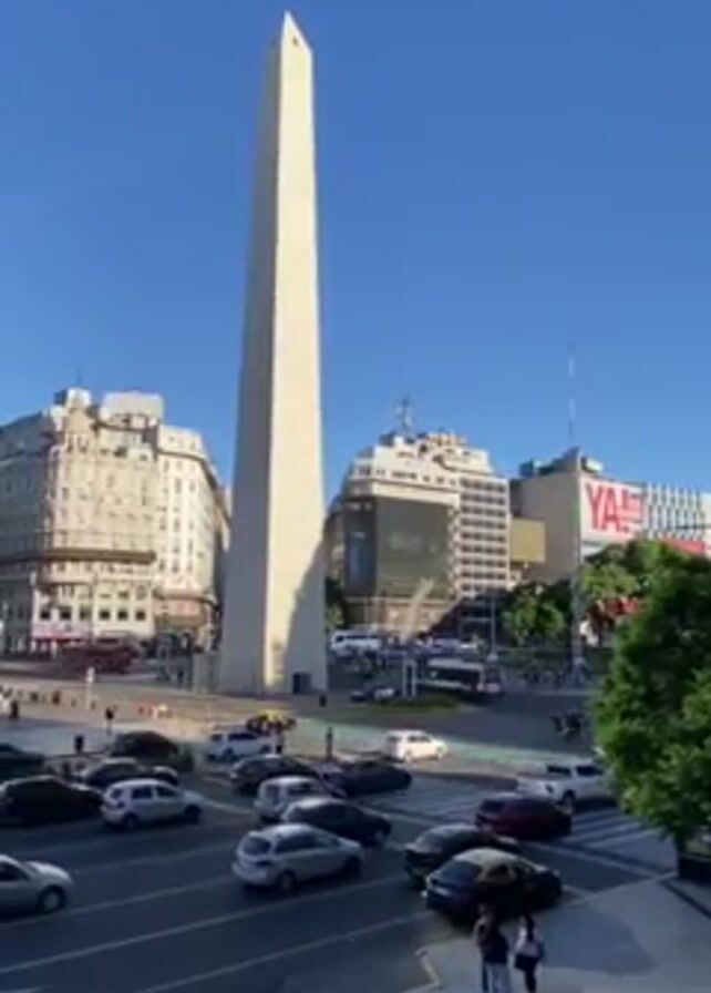 view of the Obelisco de Buenos Aires, a tall white obelisk in the center of a busy intersection