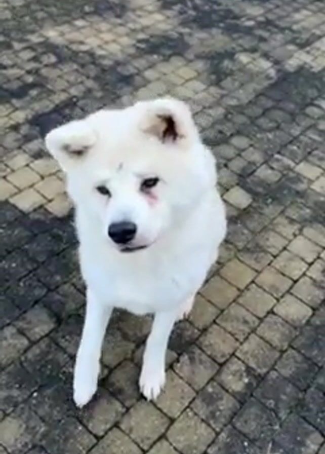 A white Akita dog is standing on a stone tile surface, looking up at the camera