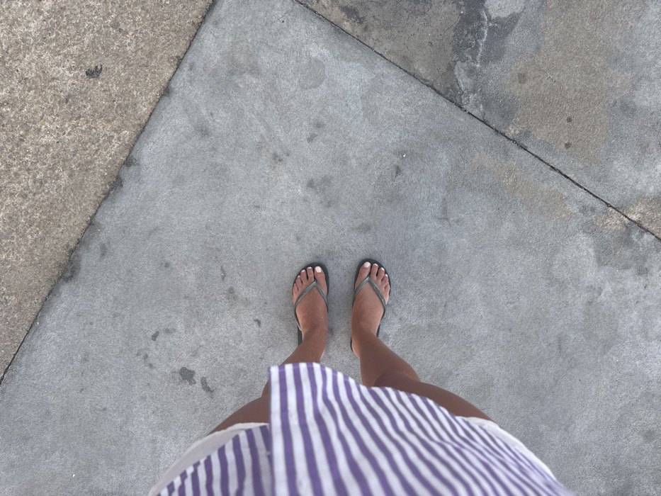 - "An overhead, slightly angled view captures an individual's lower legs and feet positioned on a gray concrete surface, identified as being in the city of Sant Elm, Spain" by FM-BS4Ql2, licensed under CC BY 4.0