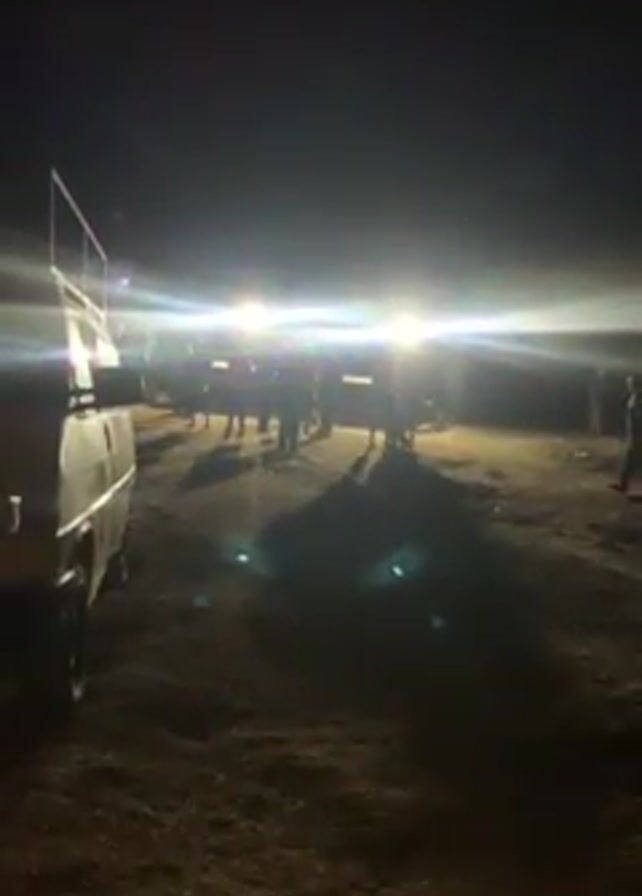 At night, a group of people is gathered near a vehicle with bright headlights. The vehicle, possibly a van or truck, is parked on the left side of the frame. The people are silhouetted by the glare of the headlights, making it difficult to distinguish individual features or actions. The ground appears to be a dirt or grassy field, with some visible debris scattered around. The overall atmosphere is dark and somewhat unclear due to the intense light and shadows. The audio suggests music is playing.