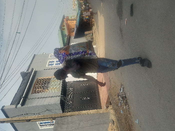 A man carries a bulky, wrapped item on his back while walking down a street. He wears jeans with torn knees, a dark shirt, and a cap. The scene includes buildings, power lines, and a partially visible blue sky. The man is walking on a paved road with debris scattered nearby, in front of a gated building.