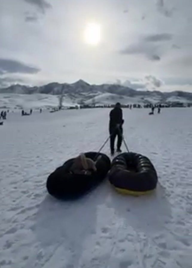 snow-covered landscape, likely a hill or a field, with snow-covered mountains in the background. The sky is overcast, and the sun is visible through the clouds. A person is seen pulling two inner tubes across the snow. One tube is black, and appears to have a small child lying in it. The other tube is brown and yellow. Other people are scattered across the field, some engaged in activities such as sledding. The camera appears to be following the person pulling the tubes. After the man gets some distance, the camera pans to the right to show the vastness of the snow-covered landscape.