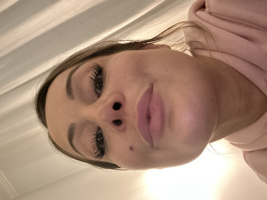 A low-angle close-up of a woman's face dominates the frame. Her features include full lips, dark, defined eyebrows, and long eyelashes. A mole is visible on her cheek. She wears a pink hoodie, only partially visible. The background is blurred, with hints of a white ceiling and light. The image is slightly rotated.