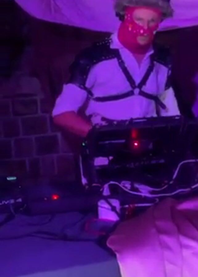 A person wearing a white button-down shirt, a black harness, a pink mask, and a fur hat with headphones, is DJing at an event. They are standing behind a DJ rig, manipulating the controls. The scene is illuminated with purple lighting. A brick wall is visible in the background, along with draped fabric.