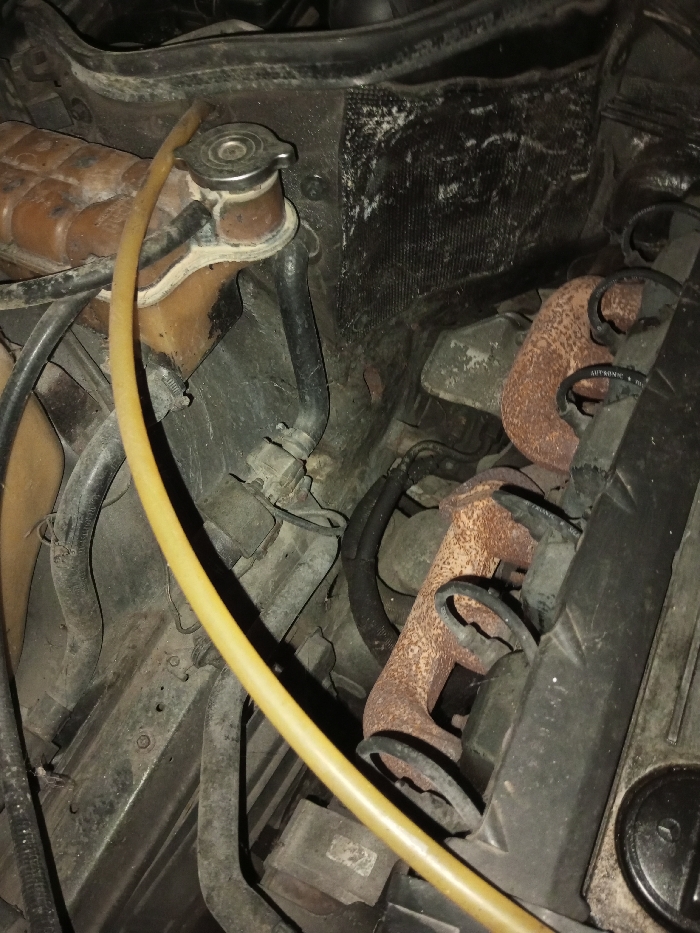 A cluttered engine bay features a coolant expansion tank with a silver cap, attached to a black panel. A yellow hose arcs across the scene. Rusted exhaust manifolds are visible, connected to the engine block. Black wires and hoses intertwine throughout the compartment. The general condition appears aged and worn.