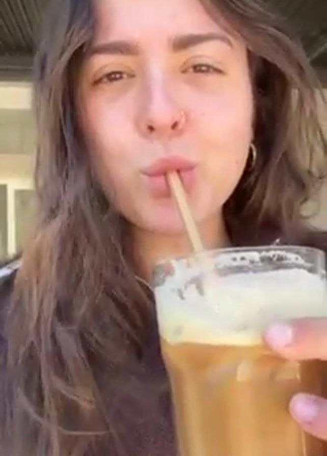 A young woman holds up a tall glass filled with an amber-colored drink and frothy white foam, taking a sip from a straw