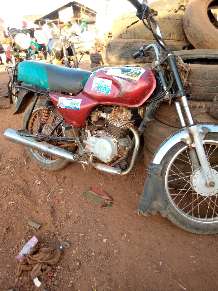 The image depicts an outdoor scene in the city of Bokkos, Nigeria, characterized by reddish-brown dirt ground under bright daylight. A maroon-colored motorcycle, consistent with a Bajaj Boxer model, is parked prominently, angled towards the right. Its fuel tank displays multiple political campaign stickers, including one stating "FOR GOVERNOR 2027" and another with a portrait of an individual. The motorcycle features a black seat with a teal rear section, a visibly dusty silver-colored engine, and a chrome exhaust pipe. The front wheel has a chrome fender with a damaged, jagged black plastic mudflap. To the immediate right of the motorcycle, a tall stack of used vehicle tires forms a backdrop. In the blurred background, to the left, multiple individuals are discernible, along with at least two other motorcycles and partial views of structures with dark roofs. Scattered debris, including a crumpled brown fabric item and a plastic wrapper, lies on the dirt ground in the foreground. No specific actions or interactions are clearly visible from the blurred human figures; the primary motorcycle is stationary.