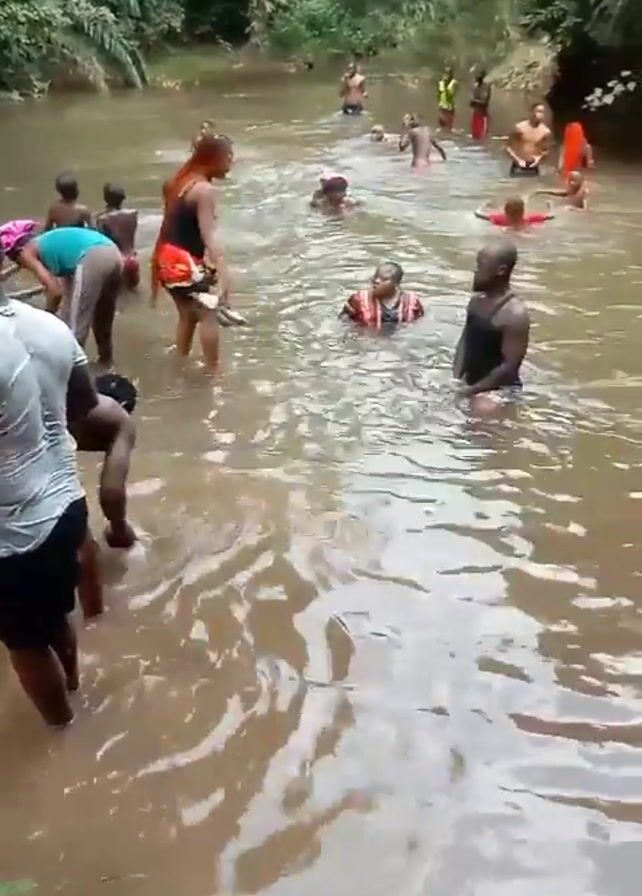 A river scene shows numerous people in the water, which is murky and brown. The environment appears to be a natural setting, bordered by lush green foliage. The people are diverse, some fully submerged, others wading or standing. Several are involved in activities such as washing with metal basins or playing in the water. The attire of the individuals ranges from casual clothing to swimwear. The atmosphere seems relaxed and communal.
