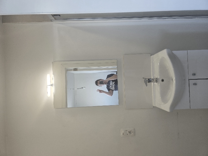 The image displays an interior view of a bathroom or washroom located in Mouscron, Belgium. The room features plain white walls and fixtures. A rectangular mirror with a white frame is centrally positioned above a white ceramic sink, which is integrated into a white two-door vanity cabinet. A chrome single-lever faucet is installed in the sink. Above the mirror, a horizontal bar light fixture with two bulbs provides illumination. A white rectangular panel serves as a backsplash between the sink and the mirror. On the left wall, a white electrical fixture containing a light switch and a European-style outlet is visible. To the far right, part of a shower enclosure with a chrome frame is present. Reflected in the mirror is an individual wearing a dark t-shirt with white, reversed text appearing to read "JACK & JONES." The individual's right hand is raised, displaying a two-finger "peace sign" gesture.
