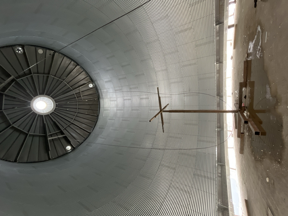 The image displays the interior of a large, empty grain silo located in Popovo, Bulgaria. The structure is cylindrical with walls composed of vertically oriented, silver-grey corrugated metal panels. A domed ceiling, constructed from radially arranged metal segments, culminates in a bright circular aperture at its apex, serving as a prominent light source. Multiple dark electrical cables are suspended from the upper interior walls. The floor consists of concrete, exhibiting dirt, debris, and several puddles of standing water. Centered on the floor is a freestanding wooden structure, appearing to be made of square timber, with a vertical post supporting four horizontal crossbeams at its top and anchored by a square base. A distinct horizontal band of intense light is visible along the base of the silo wall, indicating an external light source or opening. No individuals are present.