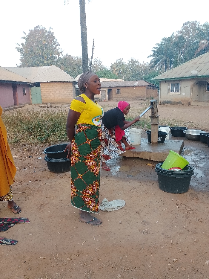 Two women stand near a water pump in a rural setting. One woman, in a yellow shirt and patterned skirt, stands tall with her headwrap. The second woman, wearing a headscarf, operates the pump. Several black buckets and a metal bowl sit on the ground near the pump. Behind them are simple buildings with corrugated metal roofs and surrounding foliage. The ground is dirt.
