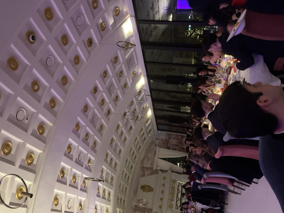 A long table filled with seated people, likely at a banquet or formal dinner, dominates the right side of the image