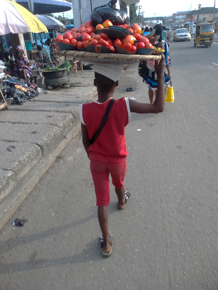 This elevated-angle, daytime photograph depicts a bustling street market or commercial area in Lagos, Nigeria. The central figure is a dark-skinned individual, likely a child or adolescent, seen from the rear, walking on the paved road. They wear a red sleeveless top with white trim, red knee-length shorts, and dark sandals. A black strap is visible across their left shoulder. This individual is balancing a large, round, flat woven tray on their head, secured by a white headwrap. The tray is laden with numerous red tomatoes, some orange fruit, and several dark bowls containing additional produce, topped by a black plastic bag. Their left arm is slightly raised, apparently for balance. To the left, a concrete sidewalk runs parallel to the road, featuring informal market stalls. Under a light-colored umbrella, a seated individual in patterned clothing is visible, attending to goods on display, which include rows of footwear. Further along the sidewalk, other vendors operate, utilizing stacked black tires as displays for green produce. Scattered debris, including plastic, is present on the ground near the curb. On the asphalt road ahead of the main subject, another person in a patterned dress carrying a yellow bag walks in the same direction. In the background, several vehicles, including cars and a yellow three-wheeled auto-rickshaw (Keke NAPEP), are present on the road. Commercial buildings line the street, with utility poles and overhead lines visible against a hazy sky.