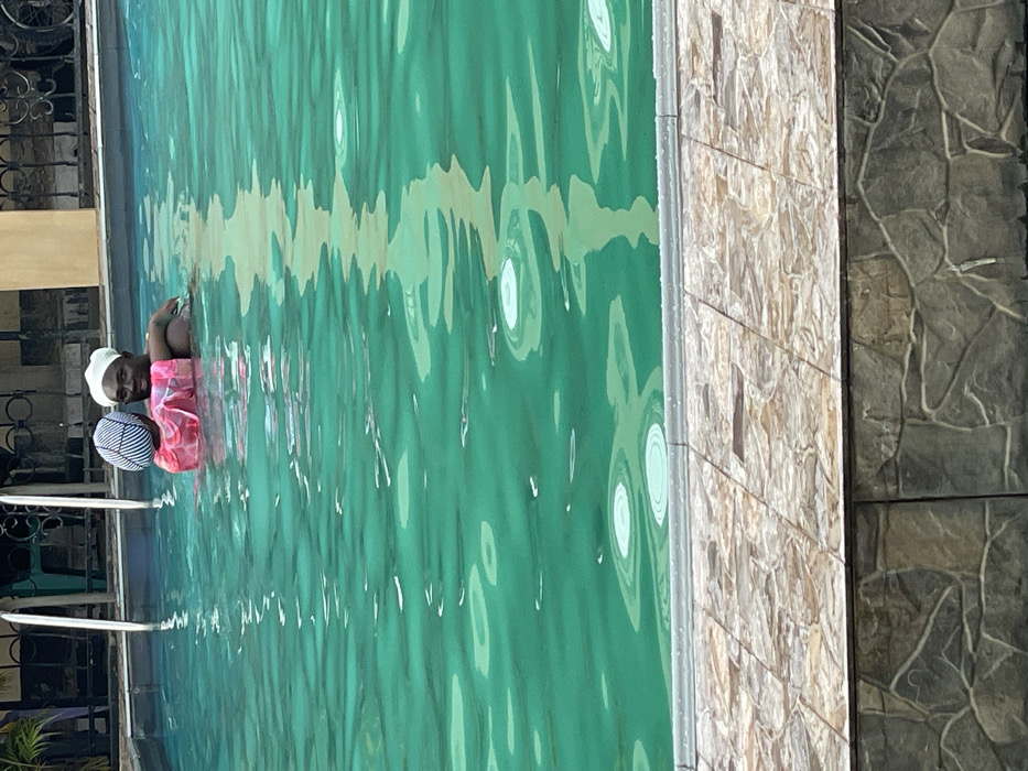 Two individuals in a swimming pool are captured in an eye-level shot. The water is vibrant green with rippling patterns. The person on the right has a white swim cap, while the other wears a striped cap. Both are partially submerged, wearing colorful floatation devices. The pool's edge is visible on the right, showing a textured, layered stone design, while a fence is seen on the left.