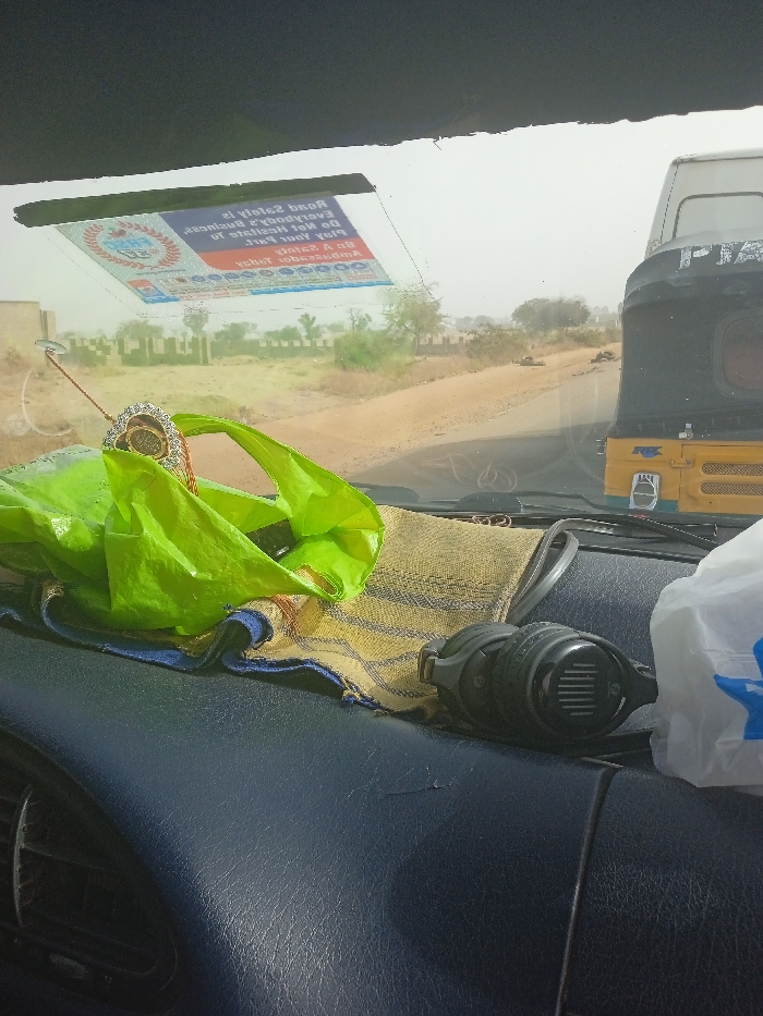 The image depicts a scene viewed from inside a vehicle, looking out through the front windshield in Tilde, Nigeria