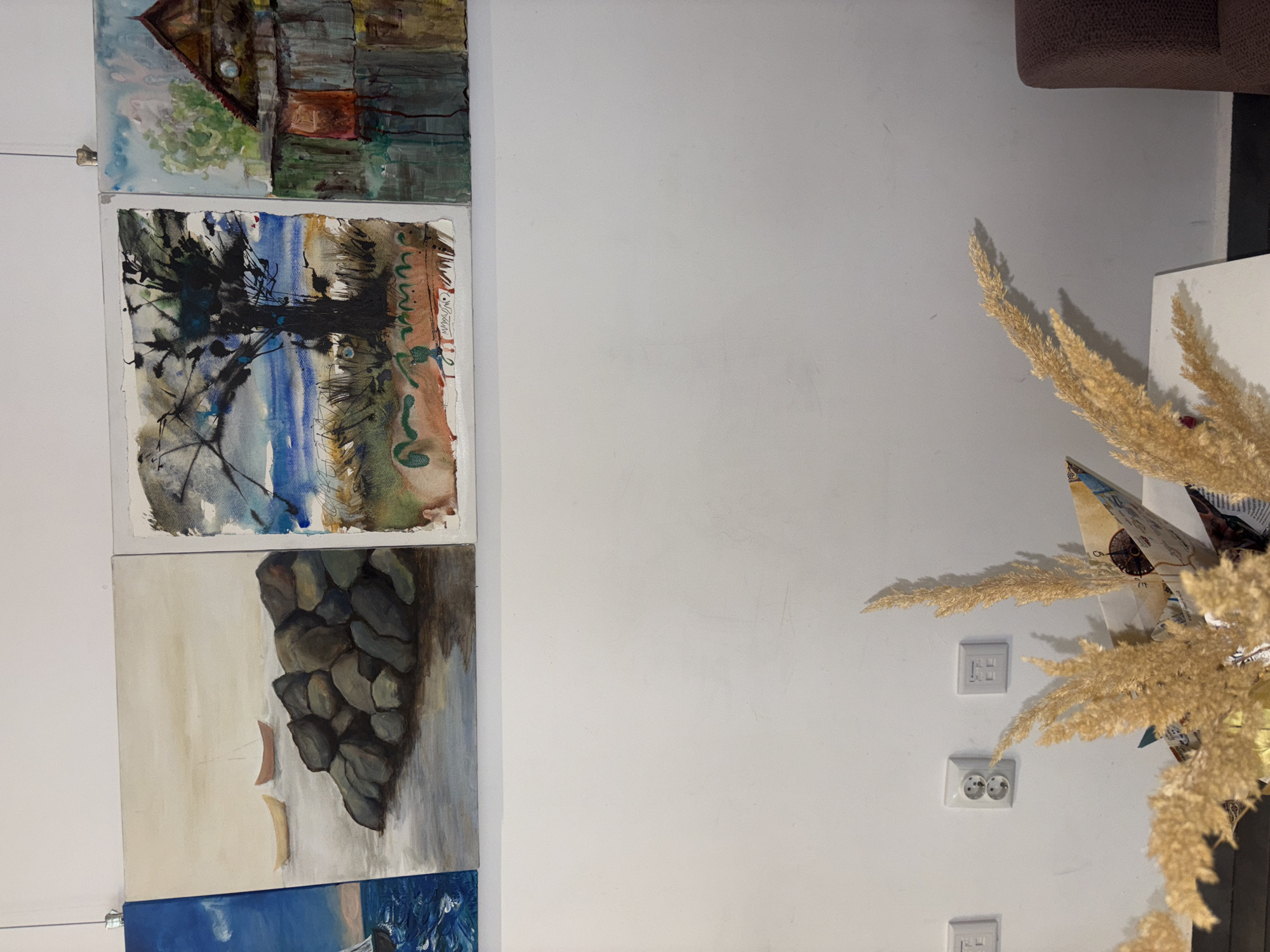 section of a wall with several paintings hanging on the left. The paintings are of different styles and subjects, including a building, a tree, and a seascape with rocks. On the right side of the image, there is a tall arrangement of dried wheat stalks. There is also a corner of a white table and part of a brown chair in the upper right. The wall is white with some electrical outlets visible. There is no specific information indicating that the location is Burgas, Bulgaria.