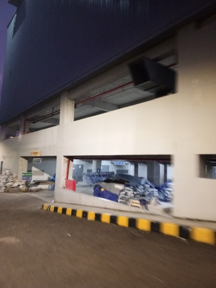 A multi-story industrial building with a corrugated metal exterior. Openings reveal an interior space with stacked materials covered in blue tarps. Warning signs are visible near an opening. A black and yellow striped barrier runs along the edge of the pavement in the foreground. The overall lighting suggests dusk or night.