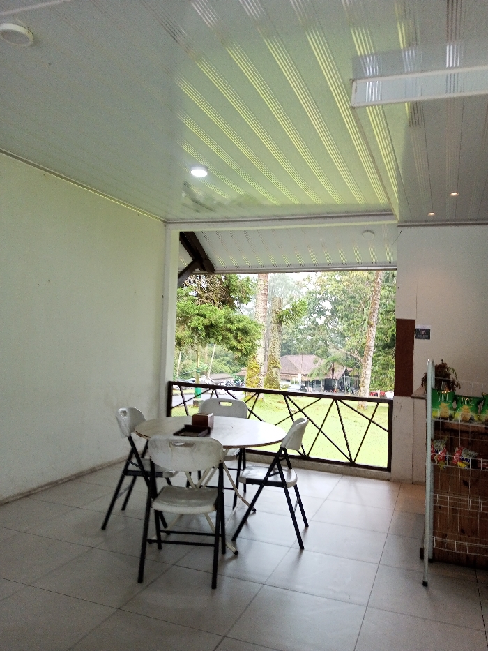 The scene depicts an unoccupied, partially enclosed, open-air dining or seating area located in Pachmarhi, India. The space features a light-colored tiled floor, off-white walls, and a white PVC strip ceiling with parallel grooves and embedded LED lighting. Centrally positioned is a round, light-colored table surrounded by four white plastic folding chairs with black frames. On the table rests a dark wooden tissue box holder and a rectangular holder, possibly for a menu. To the far right, a tall, narrow wooden display rack with wire shelves holds numerous packaged snack items. The open side of the area is bordered by a dark metal railing with a decorative criss-cross pattern. Beyond the railing, a lush green landscape unfolds, dominated by tall trees and a distant, low-slung building with a dark roof and light-colored walls, suggestive of a resort or lodge within a natural setting. No individuals are present, and no actions or interactions are occurring. The lighting suggests an overcast or diffused daylight condition.