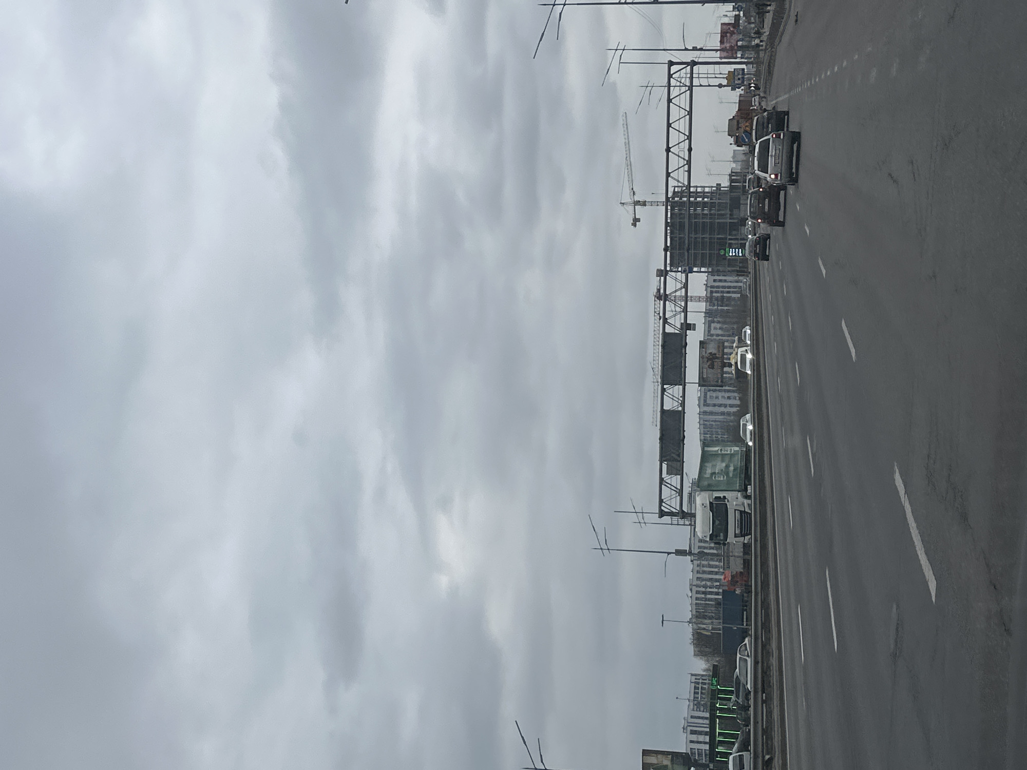 The image depicts a multi-lane asphalt highway in Kyiv, Ukraine, under a uniformly overcast, grey sky. The road surface exhibits white lane markings and minor signs of wear. Vehicular traffic includes multiple passenger cars (sedans, hatchbacks, SUVs) and a white DAF semi-truck with a green trailer, all traveling away from the viewer. Several overhead gantries, characterized by a triangular lattice design, span across the highway lanes. Numerous streetlights are present along the road and mounted on these gantries. To the left, behind a barrier, a commercial area with a structure featuring green illuminated elements and parked vehicles, including a white transit van, is visible. In the background, a dense urban skyline consists of multi-story buildings. A prominent construction site features a multi-story building framework of concrete and rebar, topped by at least two yellow tower cranes, indicating ongoing construction activity. On the far right, a paved shoulder or sidewalk runs parallel to the highway, where several pedestrians are observed. The environment suggests an urban setting during a period of minimal foliage.