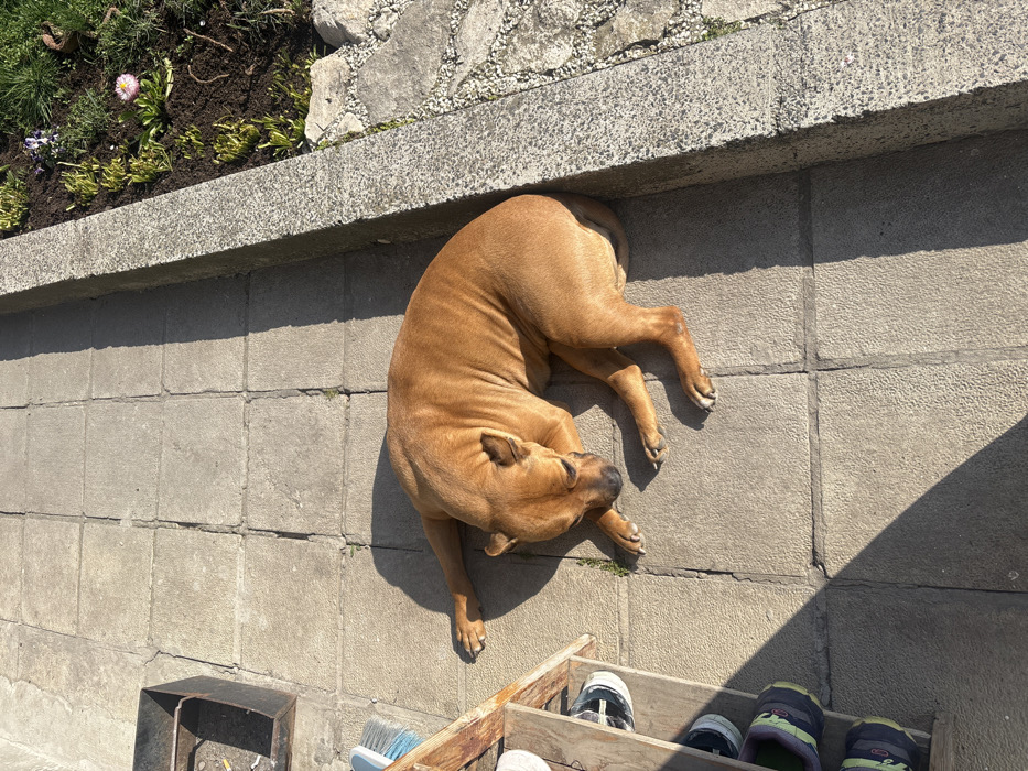 The image displays an outdoor scene in Topoli, Bulgaria. A light brown, medium-sized dog is centrally positioned, lying curled on its right side on grey concrete pavers, with its head resting on its front paws and facing left. The dog is primarily illuminated by direct sunlight. To the left, a multi-tiered wooden shoe rack is partially visible, holding a pair of light-colored shoes on its upper shelf and dark blue/green sneakers with yellow accents on a lower shelf. Above the shoe rack, in the upper-left quadrant, a dark, rectangular metal container with a handle is present. To the right of the dog and pavers, a raised garden bed, edged by a concrete curb, contains dark soil, various small green plants, a pinkish-white daisy-like flower, and other smaller purple flowers. The ground consists of square and rectangular concrete pavers exhibiting minor cracks and sparse plant growth in their seams. Strong sunlight creates a distinct diagonal shadow across the lower-left section of the pavers.