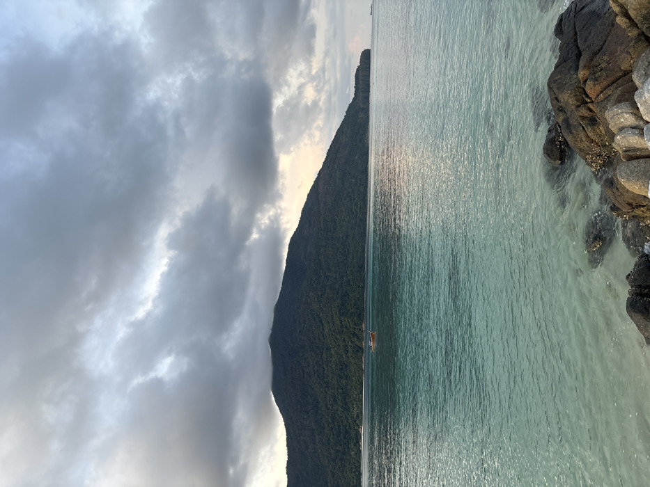 This image depicts a coastal scene in Ban Ko Li Pe, Thailand, under an overcast sky. A large, dark green, tree-covered mountain or island forms the distant landmass, with its peak partially obscured by dense, dark gray clouds that dominate the upper sky. A sliver of lighter sky is visible towards the right horizon, casting a faint reflection on the water. The sea in the foreground and mid-ground is a clear turquoise-to-aqua color, showing surface ripples and varying depths. In the middle distance, a small, orange-brown boat is positioned on the water. The immediate foreground on the right consists of a rocky shoreline composed of dark, weathered stones, some displaying marine growth. No people or overt human actions are visible. In the far distance on the right, two faint, darker shapes suggest the presence of larger vessels.