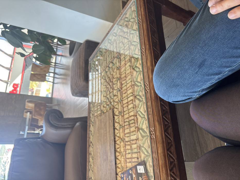 The image depicts an indoor scene, likely a cafe or lounge, located in the city of Ulcinj - Ulqin, Montenegro. In the immediate foreground, two individuals are seated, with their legs partially visible. On the left, a person's legs are covered in dark, possibly brown or black, hosiery or tights. On the right, a person's leg is covered in blue denim jeans, with a hand resting on the thigh. Between the seated individuals and the background is a rectangular coffee table with a dark brown, carved wooden frame. The table features a glass top, beneath which an intricate pattern of light brown and green geometric or mosaic-like elements is visible. A small, dark wooden rectangular mat or coaster is placed on the glass surface, and to its left, a magazine or menu with text and imagery, including "Marlboro" and a "K" logo, is visible. In the midground, to the left of the table, a dark brown leather armchair with studded armrests is present. To the right of the table, a square, ribbed, dark brown ottoman is visible. The background reveals an open space with large windows or a glass facade, allowing natural light into the area. Through these windows, parts of the exterior are visible, including a red sign with partial text ("ba"). Inside, beyond the central seating area, additional light-colored upholstered chairs with high backs and tables are arranged. A large potted plant with broad green leaves stands next to a white structural pillar on the right side of the frame. The indoor flooring appears to be made of light-colored wood.