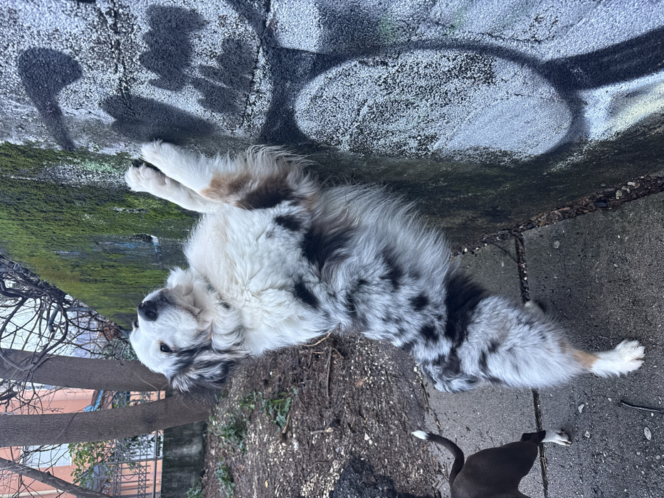 - "An Australian Shepherd with black, gray, and white fur rests on a concrete ledge covered in graffiti and moss" by FM-hkxCe2, licensed under CC BY 4.0