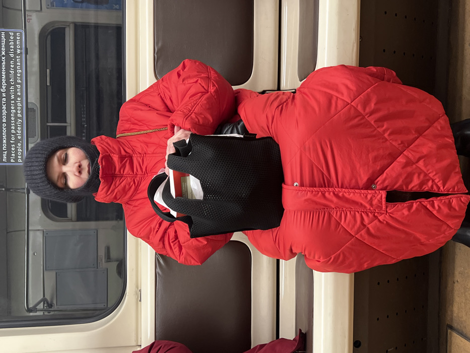 A person in a red quilted jacket and grey balaclava sits on a train seat. They are holding a black net bag. The train window is visible, along with a sign in both Russian and English that designates priority seating for elderly, disabled, and pregnant people, as well as passengers with children. The train interior includes brown upholstered seats, cream-colored panels, and a glimpse of the floor. The orientation of the image is vertical.