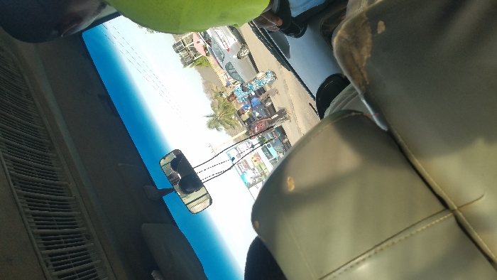 An interior view from a vehicle, showing part of the front dashboard, rearview mirror, and an adjacent leather seat. Outside the windshield, there's a sunny street scene with people, parked vehicles, and a building. The image is a little blurry, and the angle is off, suggesting it was taken quickly or from an unconventional position. A portion of someone's head is visible in the top corner.