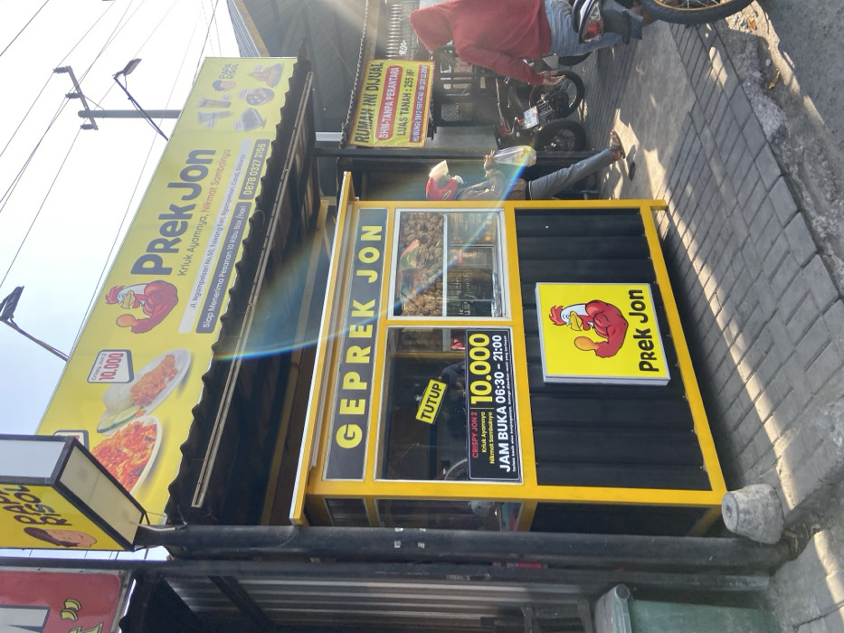 The image depicts a daytime street scene in Candi, Sidoarjo, Indonesia, specifically at Jl. Ngampelsari No. 50, Tawang Sari, Ngampelsari, Candi, Sidoarjo, a location within the broader Balonggabus area. The central feature is a "Geprek Jon" food stall, characterized by its bright yellow frame and black corrugated metal siding. An overhead yellow banner sign displays "Prek Jon" alongside a flexing chicken logo, food images, pricing (10.000 IDR), the slogan "Kriuk Ayamnya, Nikmat Sambalnya," the address "Jl. Ngampelsari No. 50, Tawang Sari, Ngampelsari, Candi, Sidoarjo," and phone number 0878 0327 3156. A smaller sign to the left advertises "PAPA RISOL." The stall's front window displays a "TUTUP" (Closed) sign, the price "10.000" for "Crispy Jon 2," and operating hours "JAM BUKA 06:30 - 21:00." Inside the stall, fried chicken pieces are visible in trays. On the lower front of the stall, an illuminated sign features the "Prek Jon" logo. To the right of the stall, a person wearing a red motorcycle helmet, a light-colored long-sleeve shirt, and grey pants stands, holding a clear plastic bag. Further to the right, another individual in a red hooded sweatshirt and blue jeans sits astride a motorcycle with a yellow rear wheel rim. A second motorcycle is parked nearby. Adjacent to the stall, a "RUMAH INI DIJUAL" (House for Sale) banner is displayed, indicating "SHM-TANPA PERANTARA" (Freehold title - No Intermediary) and a "LUAS TANAH: 255 m²" (Land Area: 255 m²). The area is paved with grey concrete pavers forming a sidewalk. A green trash bin is partially visible on the far left. The scene is under bright sunlight, producing lens flare and distinct shadows, with utility poles and power lines visible against a clear sky.