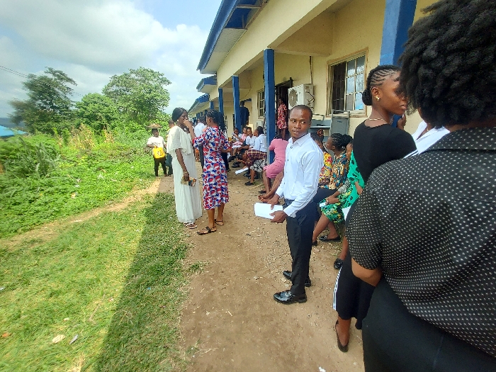 A long, single-story building with light yellow walls, dark blue eaves, and blue pillars is situated under a partly cloudy sky. The building features multiple barred windows and external air conditioning units. Approximately fifteen to twenty individuals, predominantly young adults of Black ethnicity, are gathered along the building's facade, some standing, others seated on ledges. A dirt path runs parallel to the building, bordered on the left by a strip of mown grass that transitions into dense, untamed green vegetation in the background. Key individuals include: - In the immediate foreground, the back of a person with tightly curled dark hair, wearing a black and white polka-dot short-sleeved shirt. - To their left, a young man in a white long-sleeved shirt and black trousers, holding several white papers, looking towards the left. - Adjacent to him, a young woman with braided hair pulled back, wearing a black top, visible in profile. - Further left, two women stand facing each other; one wears a long, flowing white dress, the other a multi-colored patterned dress. - In the distant left background, a person wearing a straw hat and light clothing is partially visible within the vegetation, holding a yellow object. The individuals appear to be waiting or congregating. The environment is brightly lit by daylight. The scene is located at an unspecified facility within an unknown city and country.