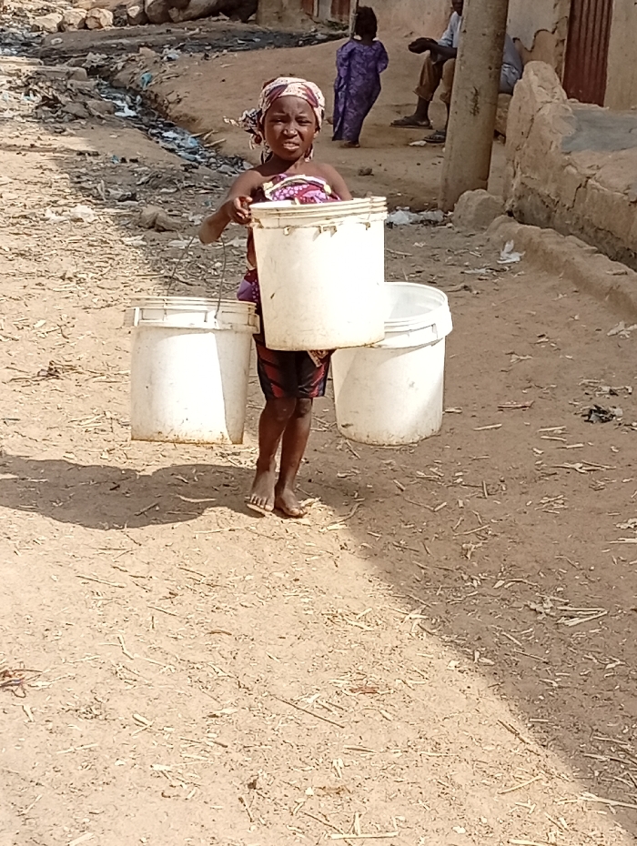 The image depicts an outdoor scene in Sabon Gari East, Nigeria, under bright daylight. The primary subject is a young, dark-skinned girl positioned centrally, walking forward with a serious expression. She is barefoot and wears a patterned headscarf and a sleeveless, patterned top. She carries three white plastic buckets, each with a metal handle: one is balanced on her head, one is held in her right hand, and another in her left hand, suggesting water transport. In the mid-ground, to the right of the girl, a light-skinned individual in a light blue or grey shirt and darker trousers is seated on a low surface, partially obscured by a utility pole or structural beam. Further left in the mid-ground, a child or smaller person in a purple patterned garment is visible, facing away from the camera. The immediate foreground and ground throughout the scene consist of dry, light brown soil or sand mixed with scattered organic debris such as straw and small sticks, indicative of an unpaved pathway. In the background, to the left, an open ditch or gutter filled with dark liquid and miscellaneous refuse, including plastic bags and other waste, is visible. Adjacent to this, piles of dark debris suggest an accumulation of refuse. On the right side of the frame, rustic structures constructed from light brown or tan mud/clay are partially visible, featuring rough textures and varying states of repair. Shadows are cast on the ground, indicating direct overhead sunlight.